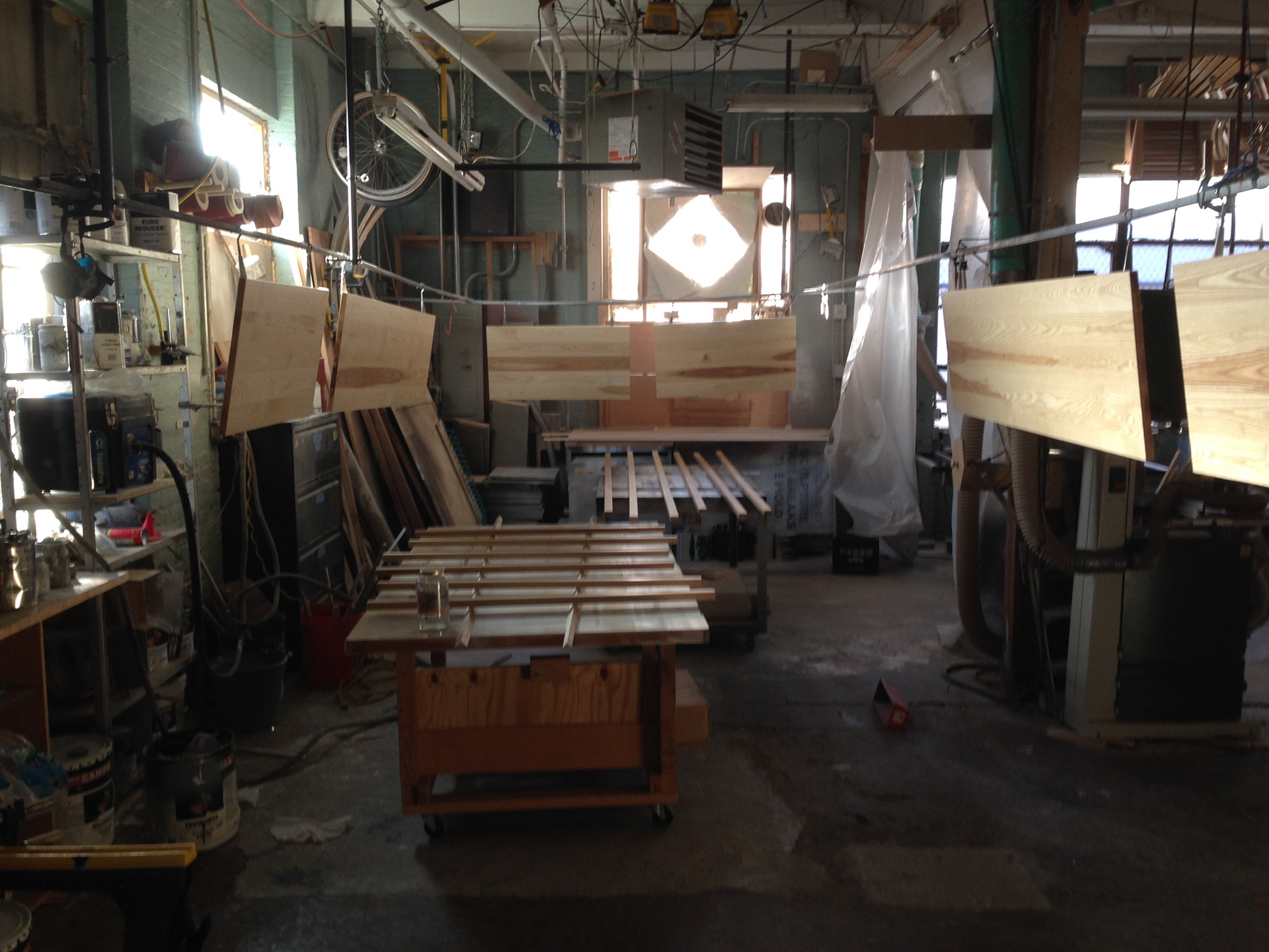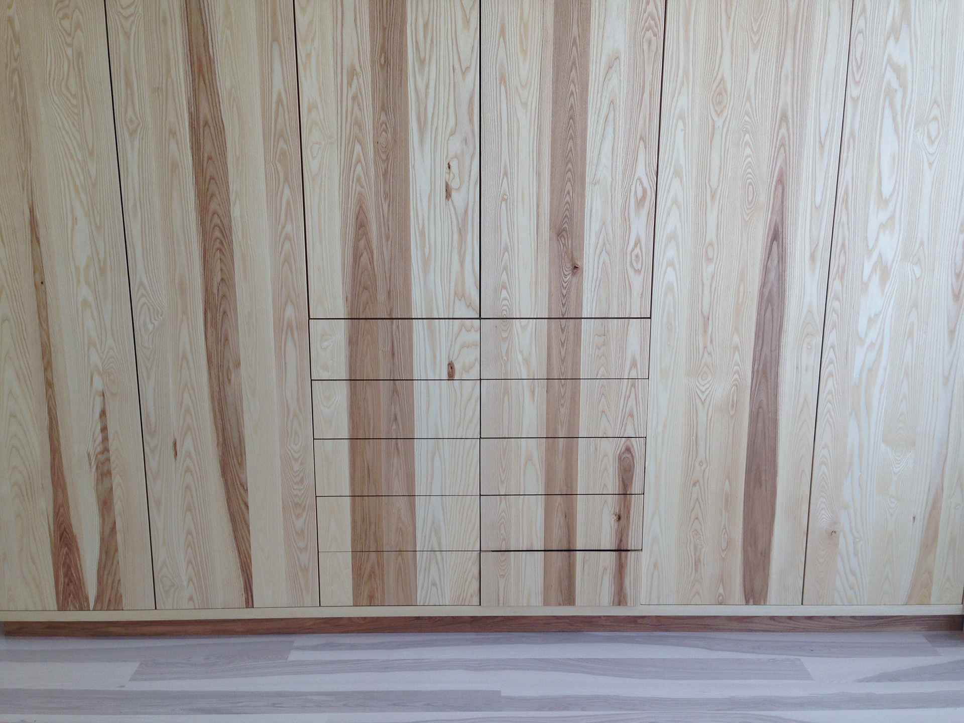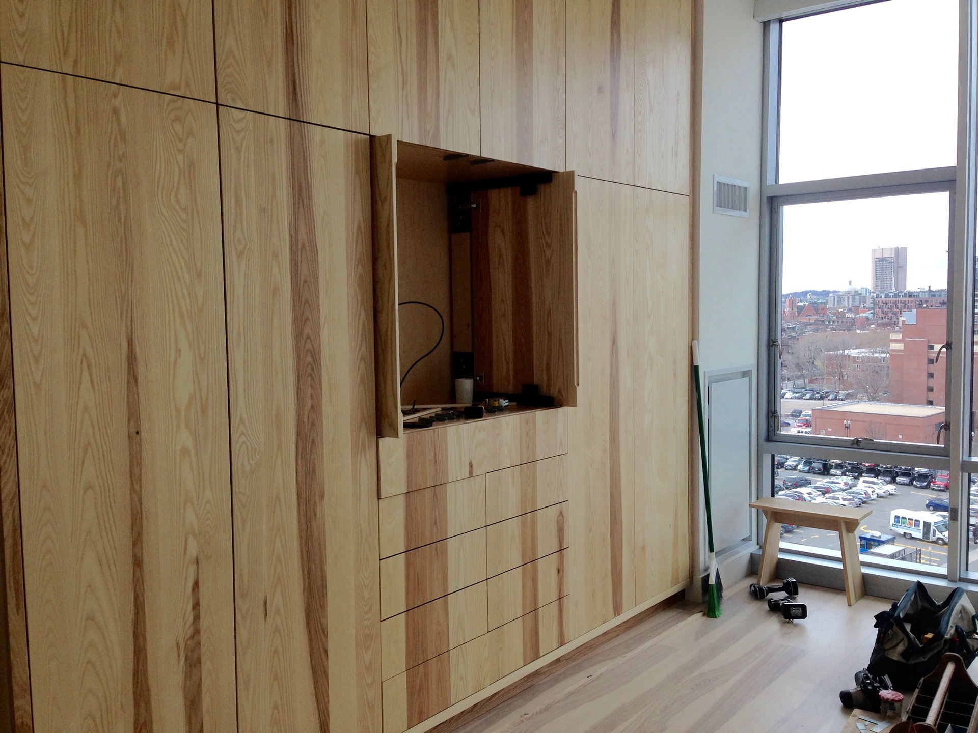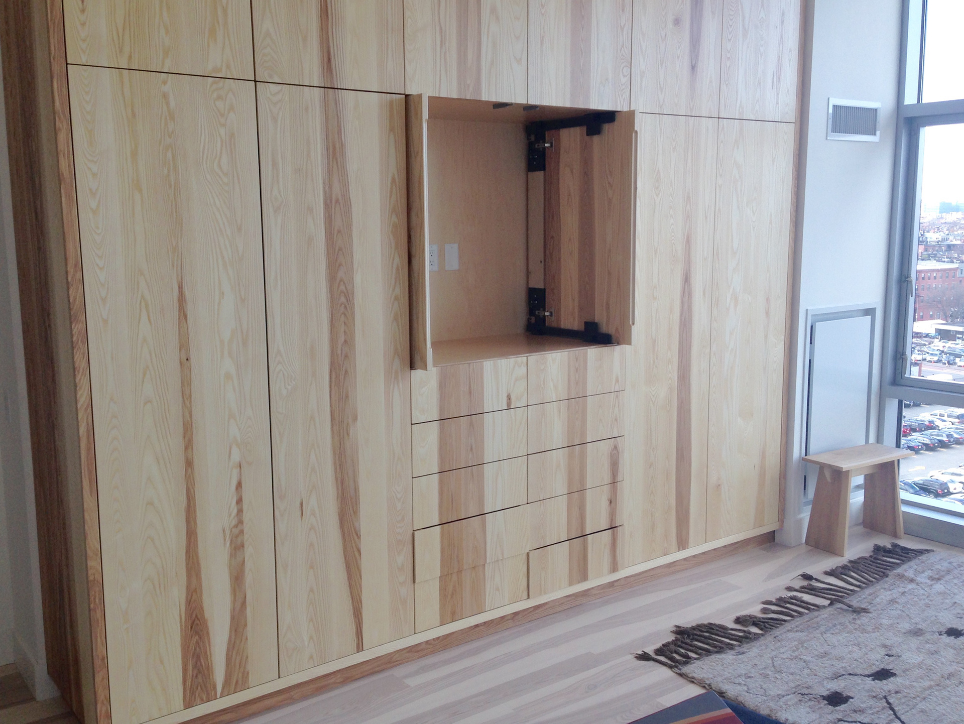 Our client asked us to create a full-wall armoire for their bedroom. The piece is made of maple with a clear-coat finish and features a continuous grain design running from floor to ceiling, as well as foldaway doors in the center for a television.