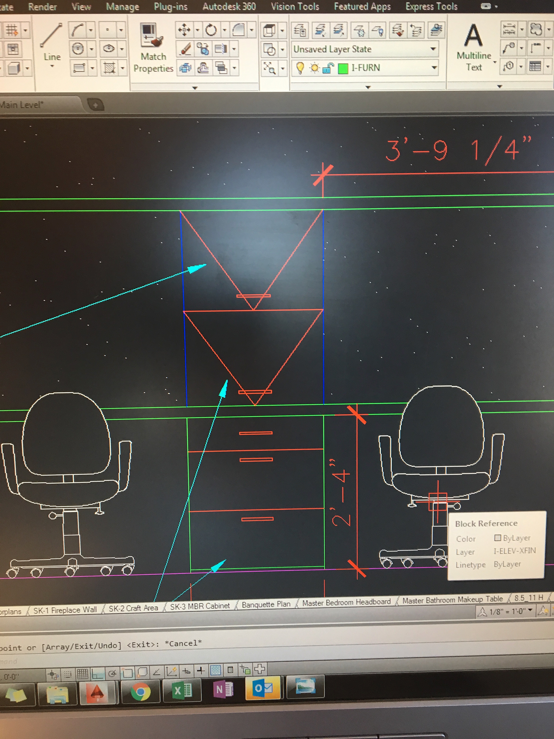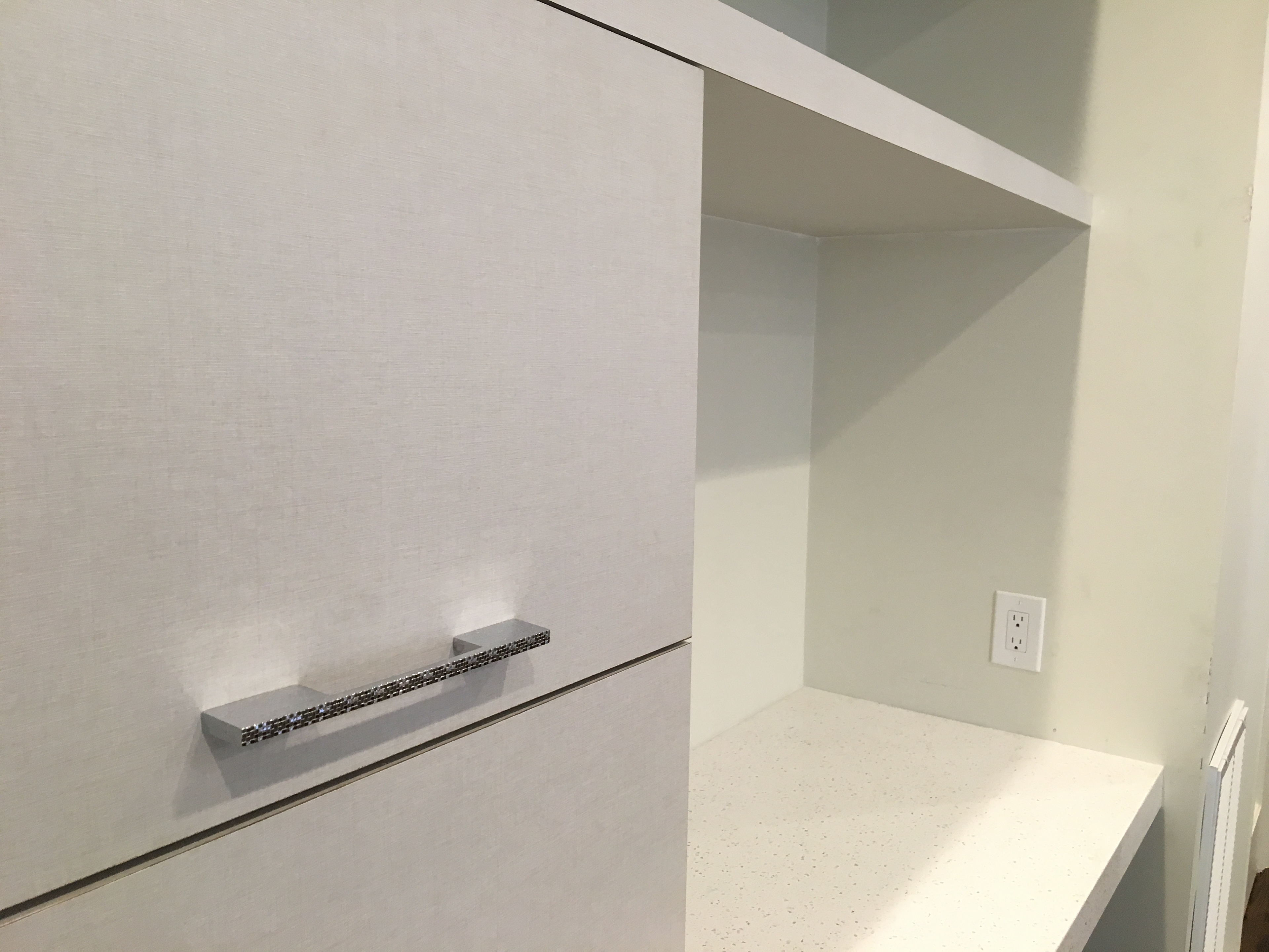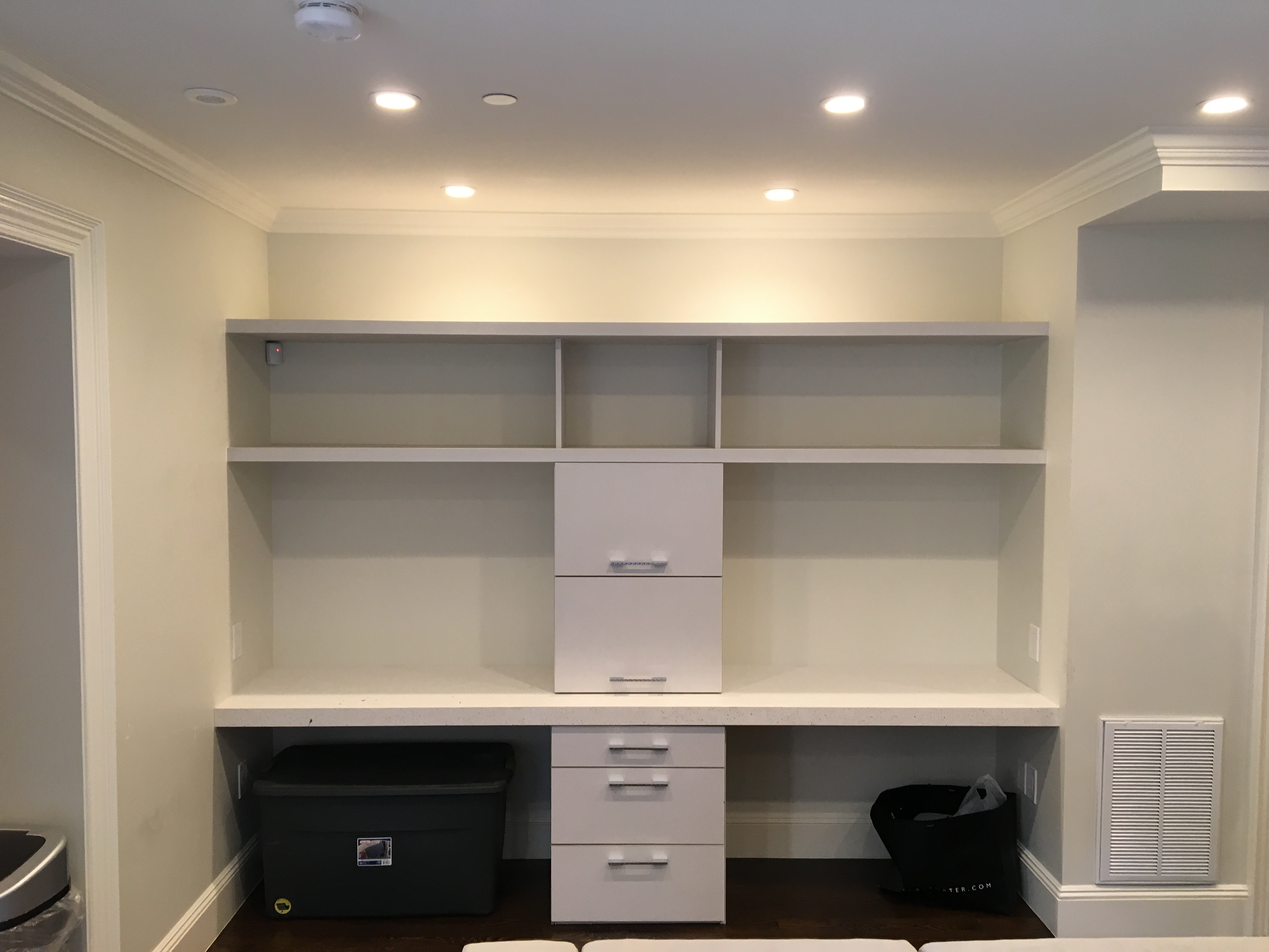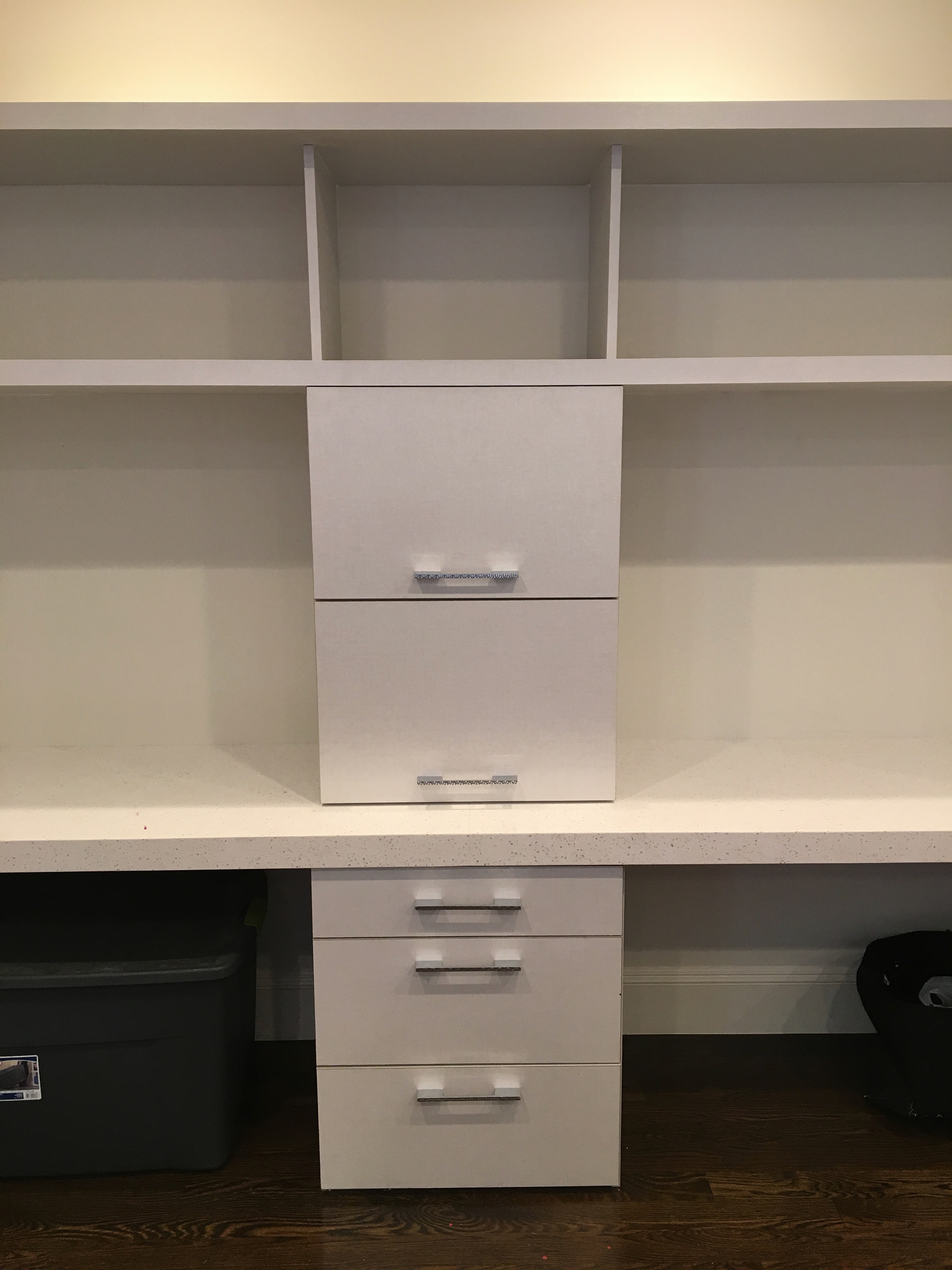 This is a built-in home office desk for a client's basement. Each part was cut to size before applying a custom laminate by hand. Each unit (shelf, cabinet, tabletop, drawers) was then trimmed and assembled on-site.