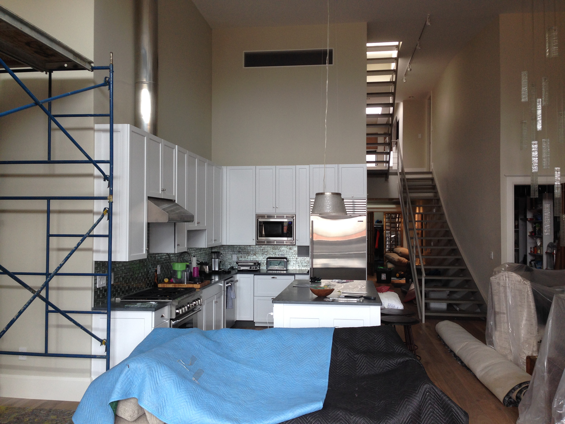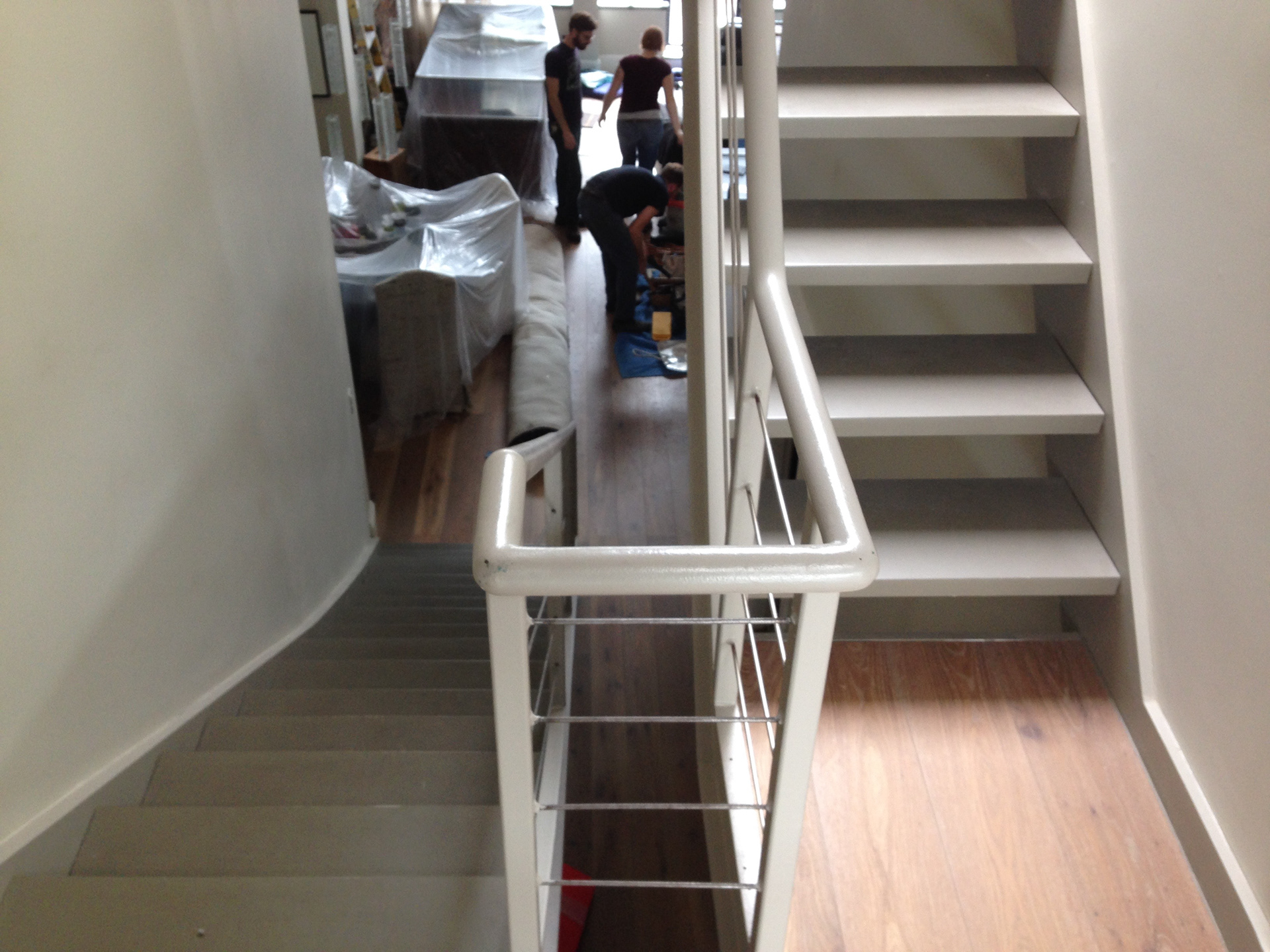 We replaced the painted stair treads in this South End loft with clear-coated white oak treads. The stair wall has a subtle curve so each step was scribed and cut on-site.