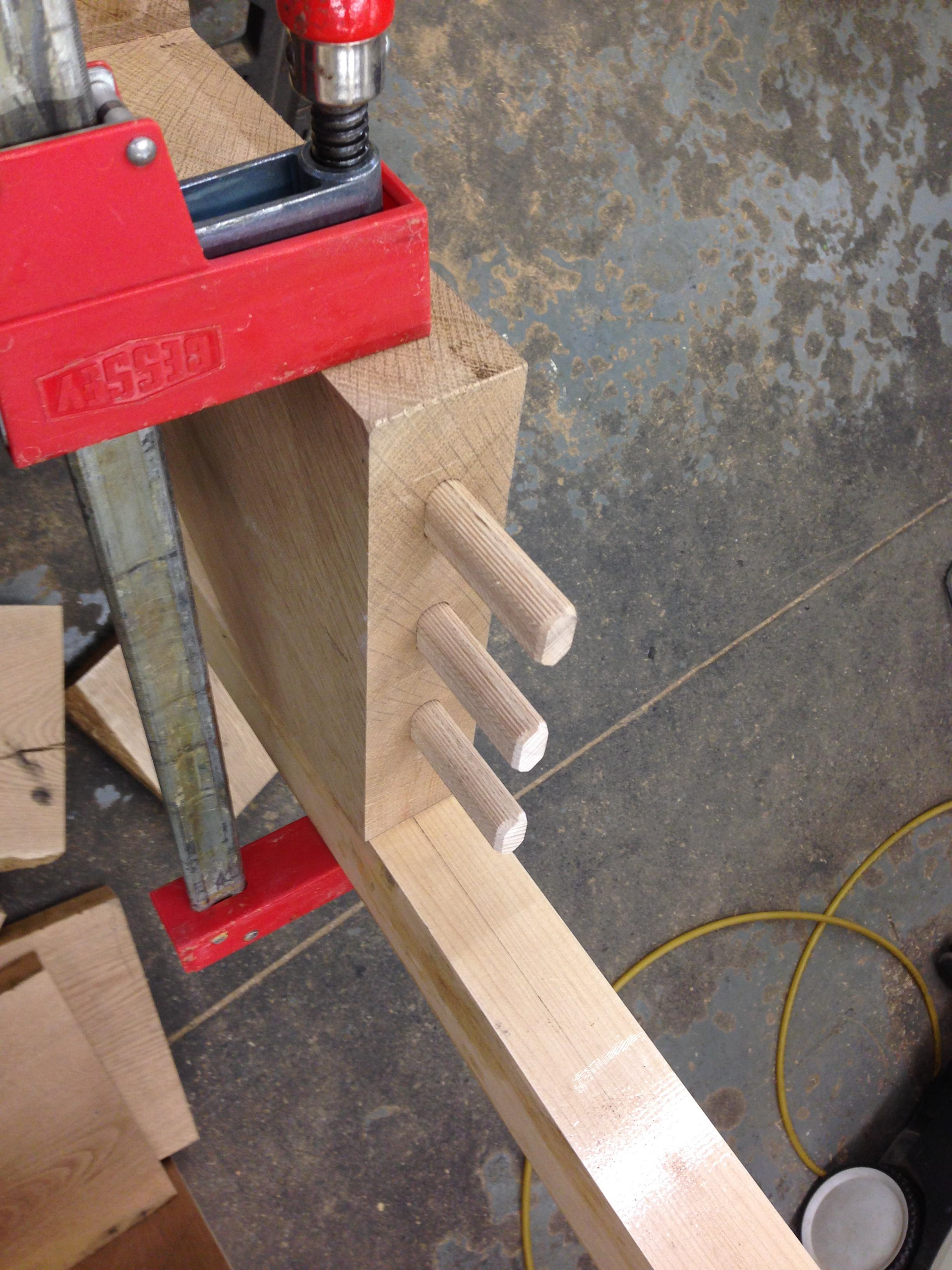 We helped our friend build exposed solid white oak stringers for the main staircase at his Cambridge home. Potential weak points were reinforced by recessed steel bars with solid white oak covers and connection points at each landing were attached using large dominos.