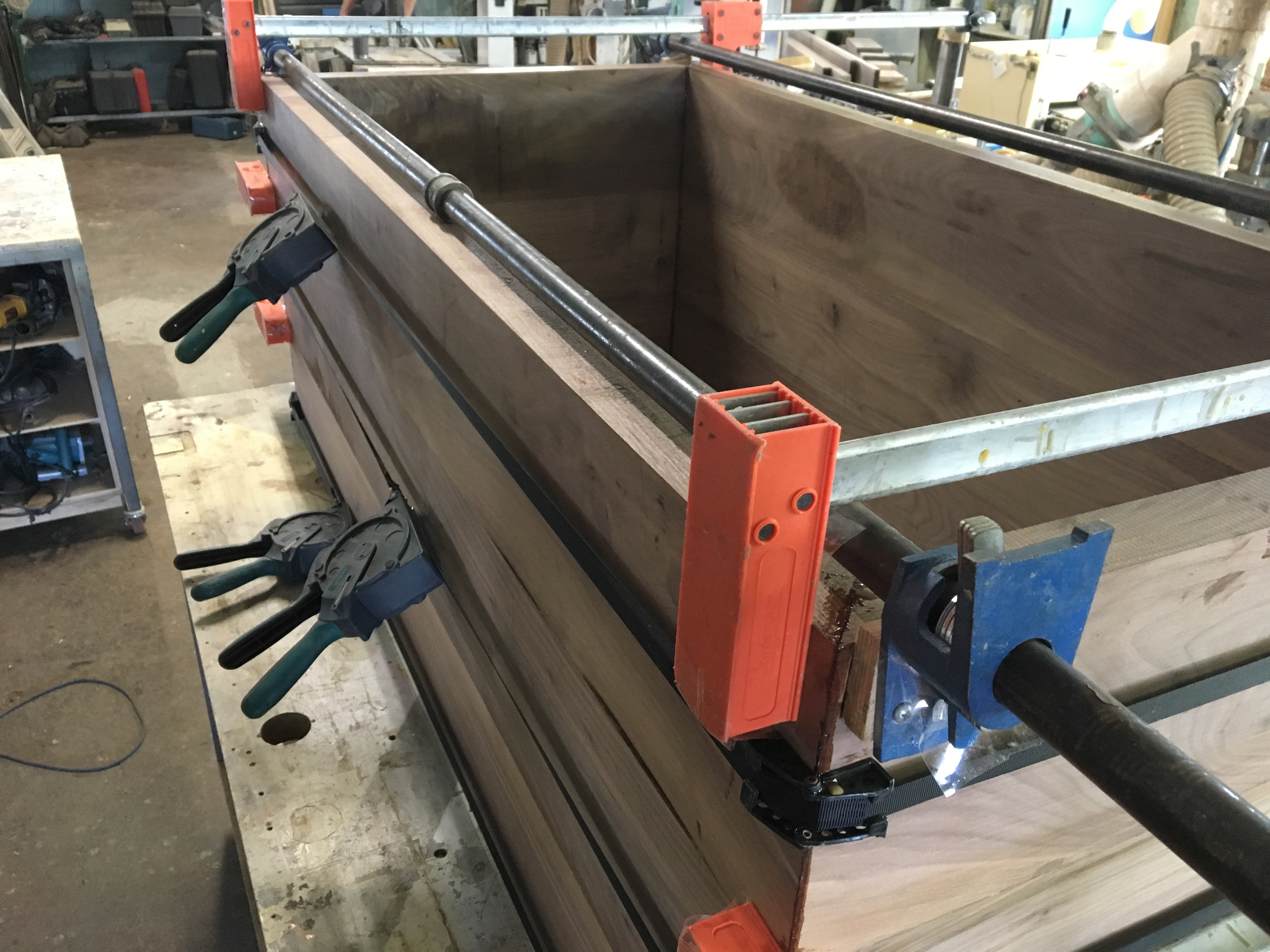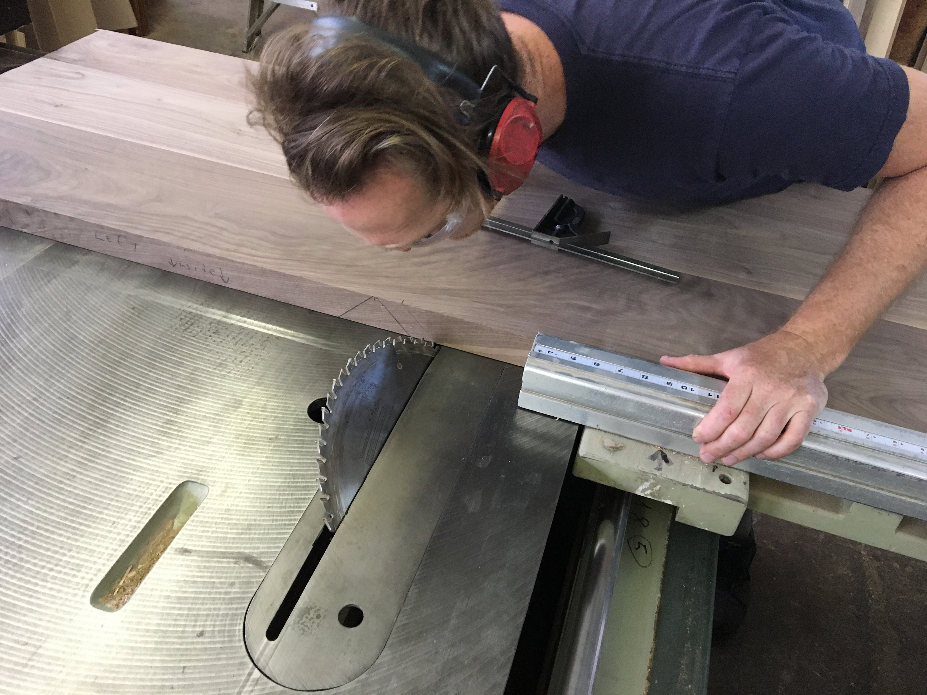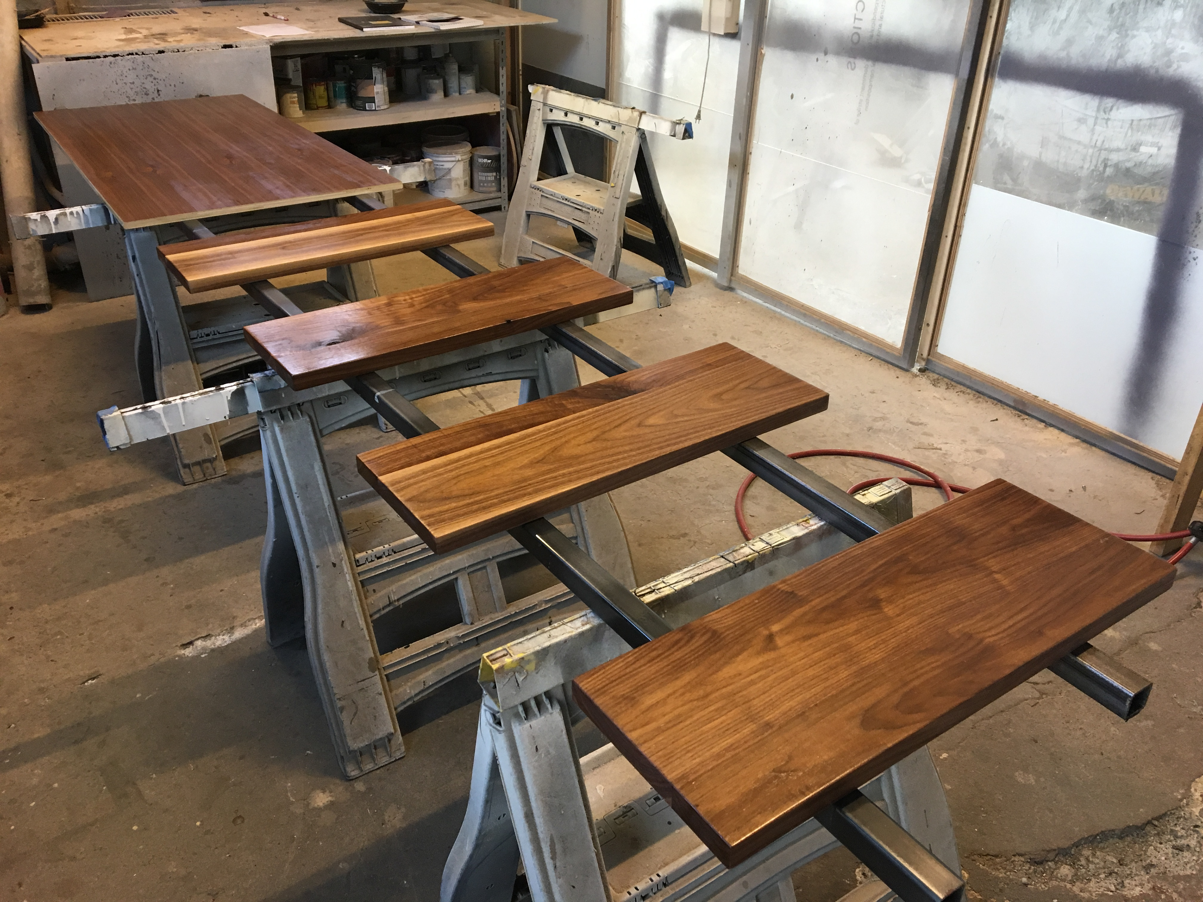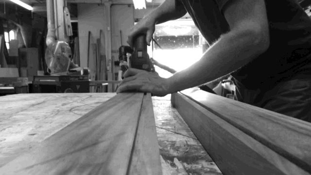 We created a matching mirror and vanity set for a client's master bathroom. The vanity has continuous grain drawer fronts and waterfall mitered edges. The mirror has interior shelving and tracks for the glass to slide. Both pieces are clear-coated solid walnut.